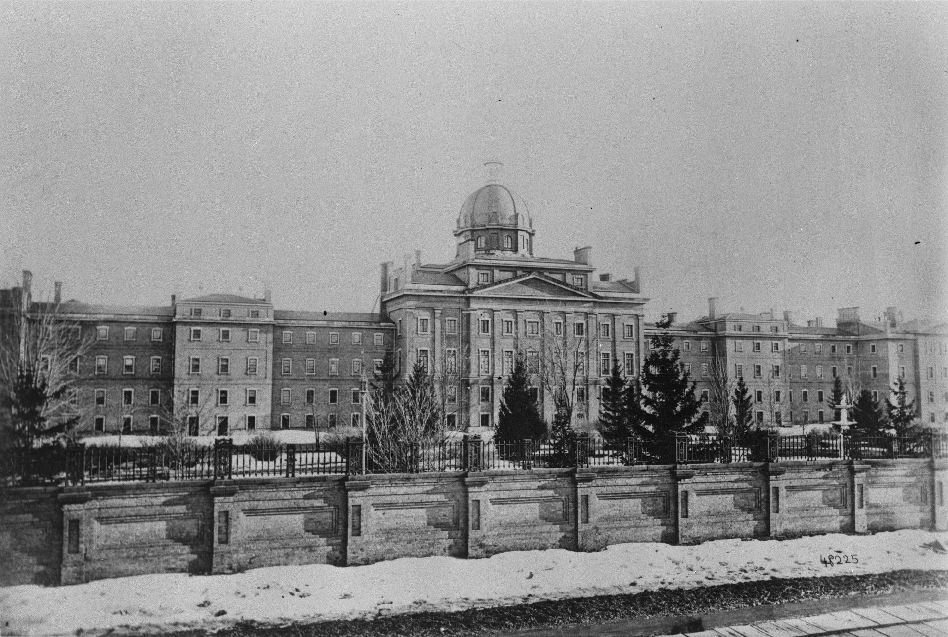 Meanwhile, with temperatures hovering just below freezing and a light snow floating down with barely a wind, Victoria arrived with the other patients in Cobourg. They were transported en masse from the train station and driven up the snow-covered hill to the asylum’s outdoor stairs to ascend to their new home. This hospital was more humble in size than the Toronto asylum, housing slightly less than 400 women, but had an air of sophistication with its light-coloured brick and symmetrical wings running parallel to the road. Four neoclassical columns, each three stories high, flanked the centre-located outdoor stairway, and a prominent cupola graced the centre roof. Its aesthetics did not feel as intimidating and institutional, perhaps because the building was originally erected in the mid-1800s as an educational academy, later to become Victoria College University until it merged with the University of Toronto. It closed its Cobourg doors to academia in 1892. A decade later, the Ontario Hospital, Cobourg, was inaugurated as the province’s sole women-only facility. (All asylums in 1919 were renamed Ontario Hospitals to help remove the “asylum” stigma.)